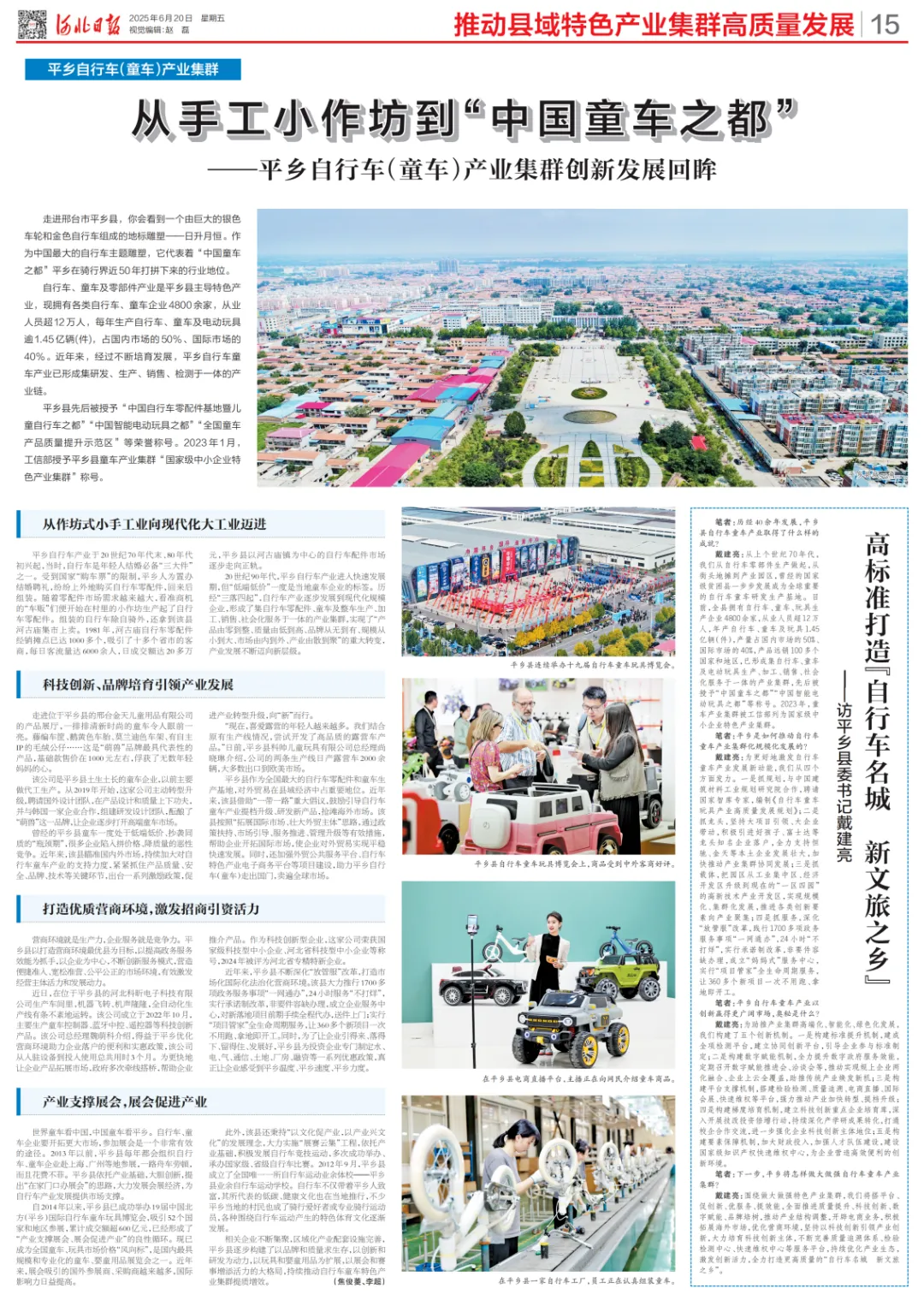 The children's bicycle industry in Pingxiang Country, Hebei Province, originated from the robust bicycle parts manufacturing sector that flourished in the 1980s. After four decades of accumulation and transformation, it has now evolved into China's largest and most comprehensively integrated production base for children's bicycles. The industry generates annual sales revenue exceeding RMB 30 billion, with an annual output of 145 million of children's bicycles, bicycles, and electric ride-on toys, accounting for approximately 50% of the domestic market share and over 40% of the international market share. Its products are exported to more than 60 countries and regions worldwide. The county is home to over 2,600 enterprises related to children's bicycles, employing 120,000 people. It has been awarded 16 national-level titles, including "China's Capital of Children's Bicycles",forming a healthy industrial ecosystem characterized by "core-driven development, park-based agglomeration and county-wide coordination".